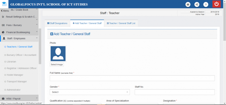 4. click on the Add Teacher / General Staff tab. Then the image below should appear.