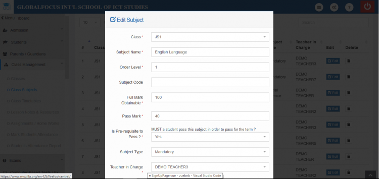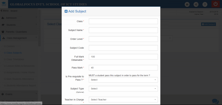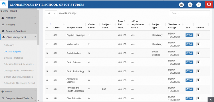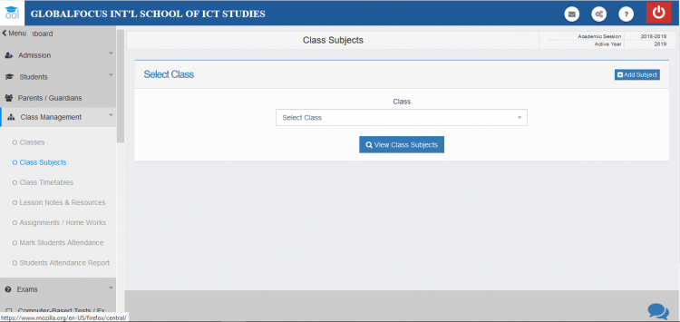 To create and manage class subjects, click the Class Management menu from the dashboard and click on the Class Subjects link.