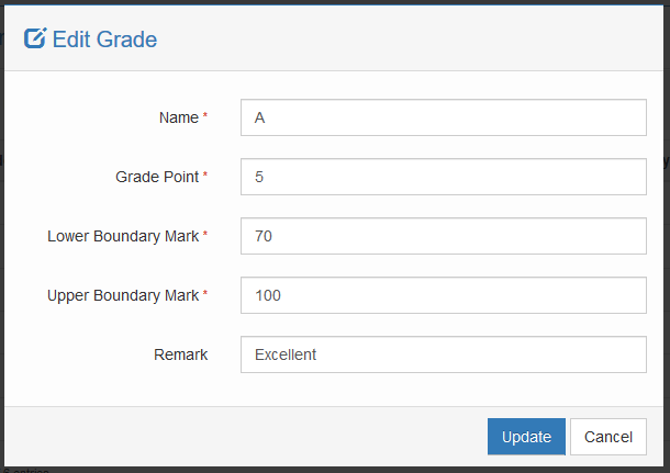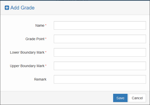 2. Enter the details of the grade. The lower and upper boundary marks indicate the minimun and maximum scores a student will get to obtain the grade.