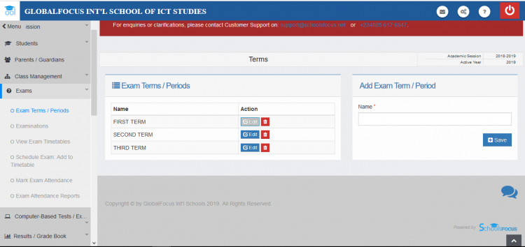 1. Click the Exams menu in the dashboard, then click the Exam Terms / Periods link to open the Terms Configuration Page