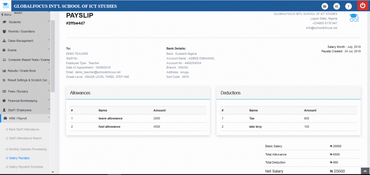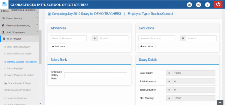 The monthly account procesing allows Bursers or other designated staff to calculate the total salary due to employees. It takes care of allowances,deductions and generates payment slips for each staff.