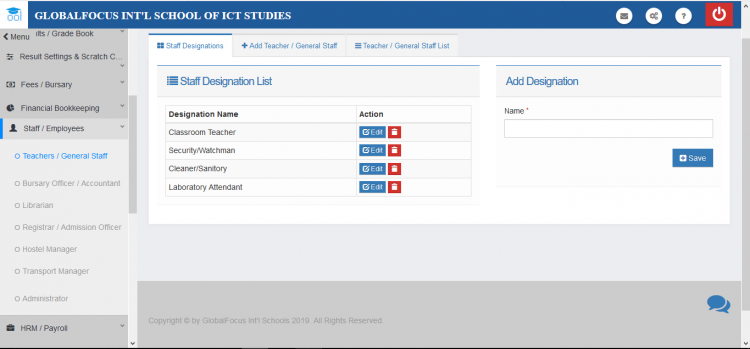 The Teachers and Staff Designations can be used to create custom roles or categoris. This categories can be anything ranging from classroom teachers to cleaners. To create a designtion, follow the below steps..