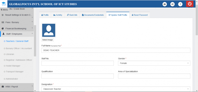 5. Click on the Update Staff Profile tab to reveal the update form. You should see similar image below.